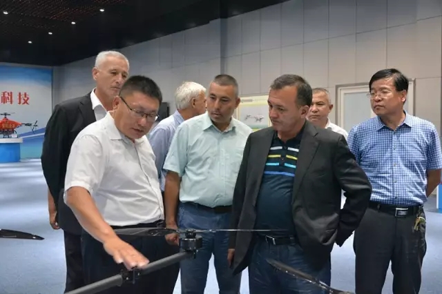 考察團一行在全豐航空董事長王志國的陪同下,首先參觀了無人機展廳。當王總介紹3WQF120-12型油動單旋翼植保無人機時,塔沙耶夫和隨行專家詳細詢問了該款機型的載重及續(xù)航能力,每天的作業(yè)量有多少,一天能夠起飛多少個架次,邊聽介紹邊讓工作人員詳細記錄下來。